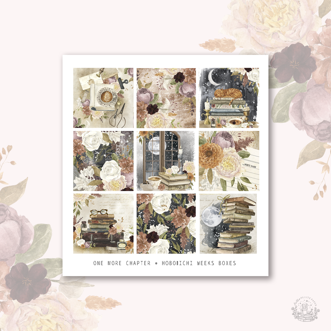 A set of 9 mini deco boxes sized for the hobonichi weeks planners (or any other planners) matching the "One more chapter" collection.